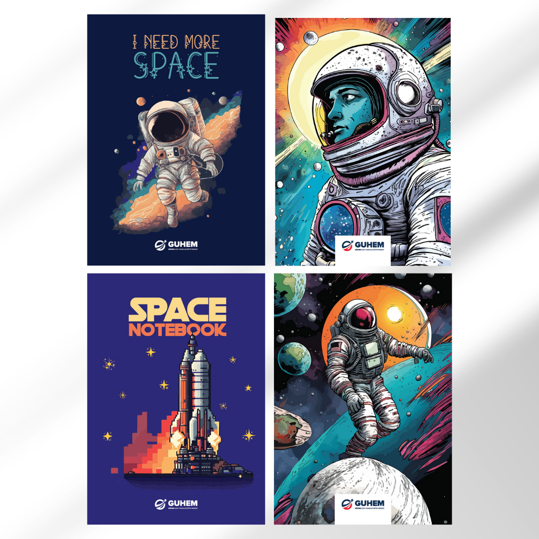 Hayallerinizi, projelerinizi ve düşüncelerinizi uzay temasıyla kaydedin! Dört farklı kapak tasarımına sahip bu özel not defteri seti, çizgisiz sayfalarıyla hem not almaya hem çizim yapmaya uygun.
