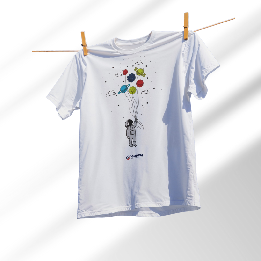 Uzay havacılık meraklılarının gardırobunda mutlaka olması gereken eğlenceli ve şık tasarım! Gezegen balonlarıyla gökyüzüne yükselen astronot figürlü bu özel tişört, hayal gücünü harekete geçiren bir tasarım sunuyor. Beyaz pamuklu kumaş üzerine renkli baskı ile üretilmiş, günlük kullanıma uygun konforlu bir kıyafet.