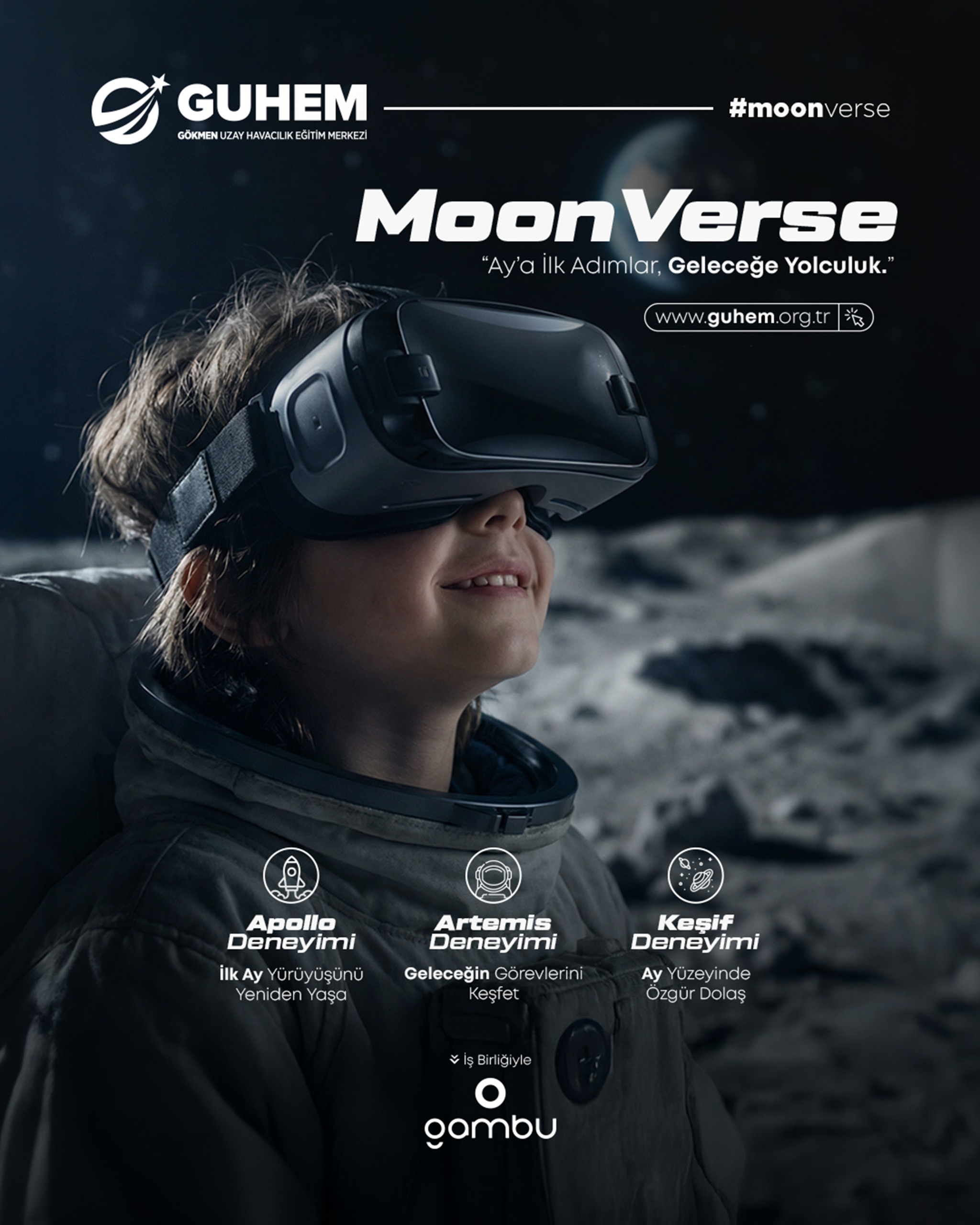 MoonVerse; profesyonel 1/6 yerçekimi simülatörü ve VR teknolojisi ile sizi Ay’ın yüzeyine taşıyor. Apollo’dan Artemis’e uzanan deneyim hattında hem tarihe hem geleceğe adım atın.